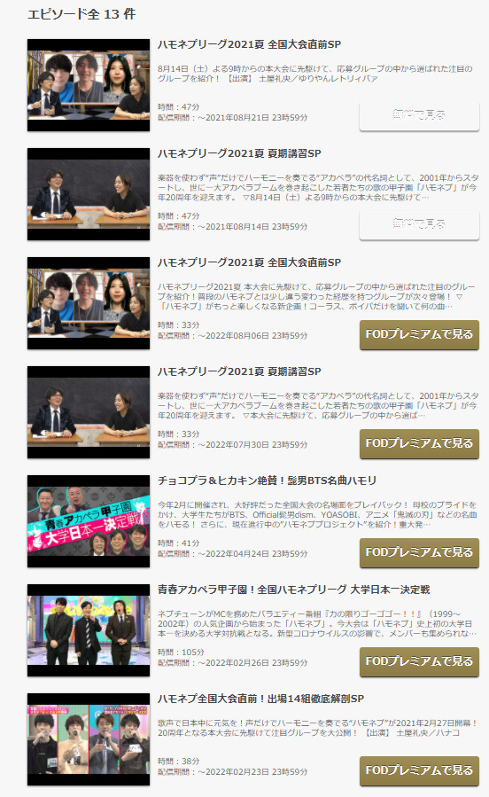 しかも、今回の放送だけでなく、過去の放送や特別企画の配信もやっており、2021年8月14日現在では。13タイトルのハモネプが見ることが出います!