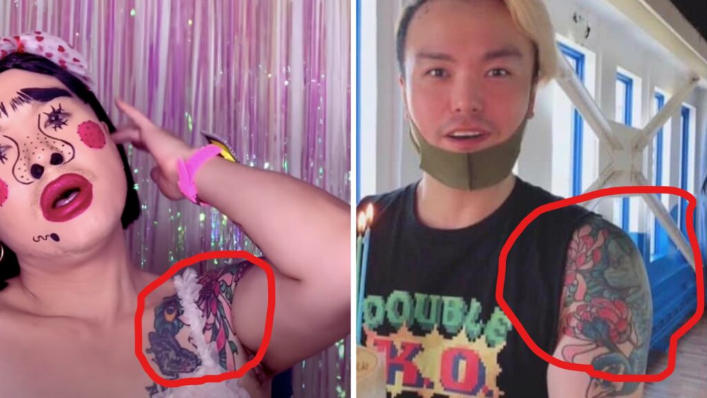 青い絵柄のようなタトゥーとピンク色の花が特徴的ですがかなり似ているようにも思います。