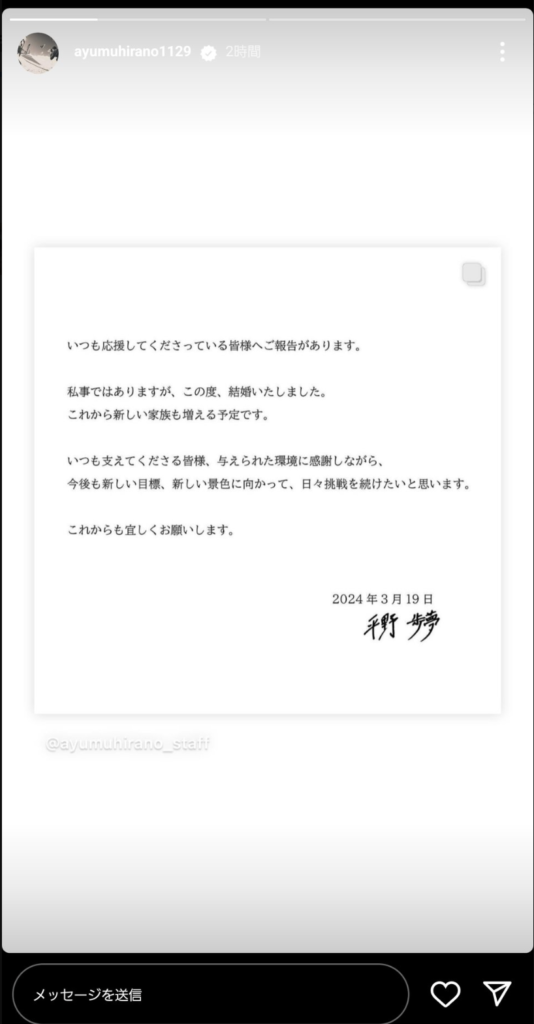 公式サイトにて「私事ではありますが、この度、結婚いたしました。これから新しい家族も増える予定です」と伝え「今後も新しい目標、新しい景色に向かって、日々挑戦を続けたいと思います」と記した。 pic.twitter.com/lBwc6djwhu