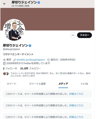 米国株でFIREを煽っていた厚切りジェイソン氏、全ツイ消ししたのか。