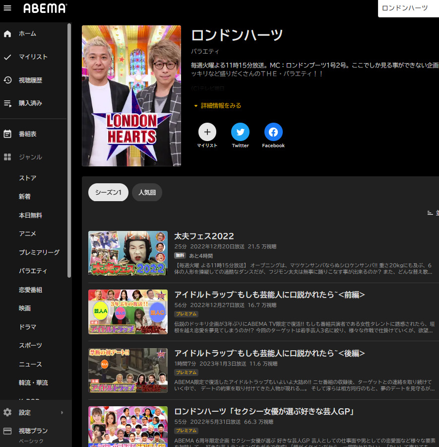 ロンドンハーツが無料で見れる可能性があるのはABEMA(アベマ)プレミアムのみとなっています!