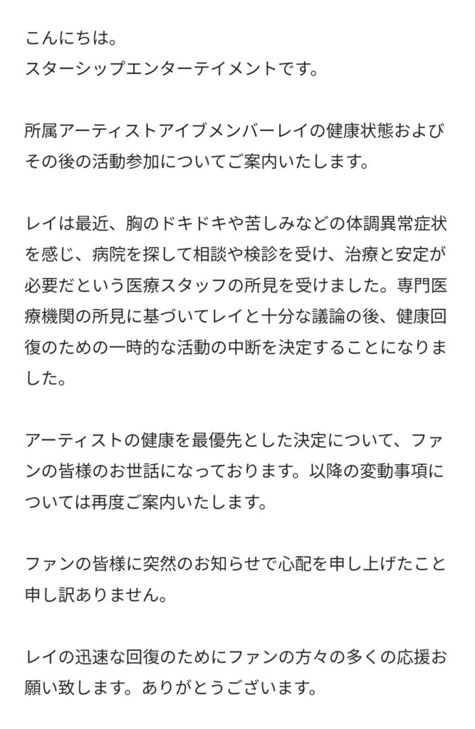 2023年4月11日にIVEのグループが所属しているスターシップエンターテイメントがレイちゃんが健康のために活動を休止することを発表させました!