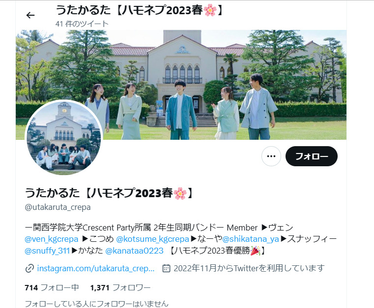 私たちは、関西学院大学2年生同期バンド「うたかるた」です!この度、#ハモネプ2023 に出演することが決定いたしました。私たちが作る癒しの世界観を、放送で是非ご覧ください!!
