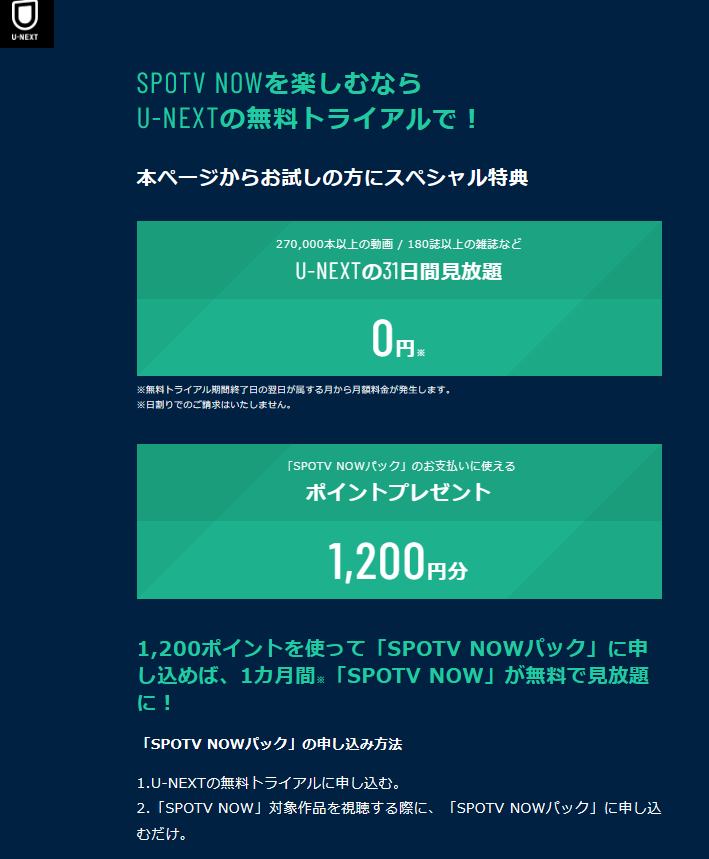今まで基本的には月額料金を初月であっても払わなければいけませんでしたが、現在こちらを見ていただいてもわかる通り、u-nextと実際にSPOTV NOWが協力しているので、どちらとも無料となっています。