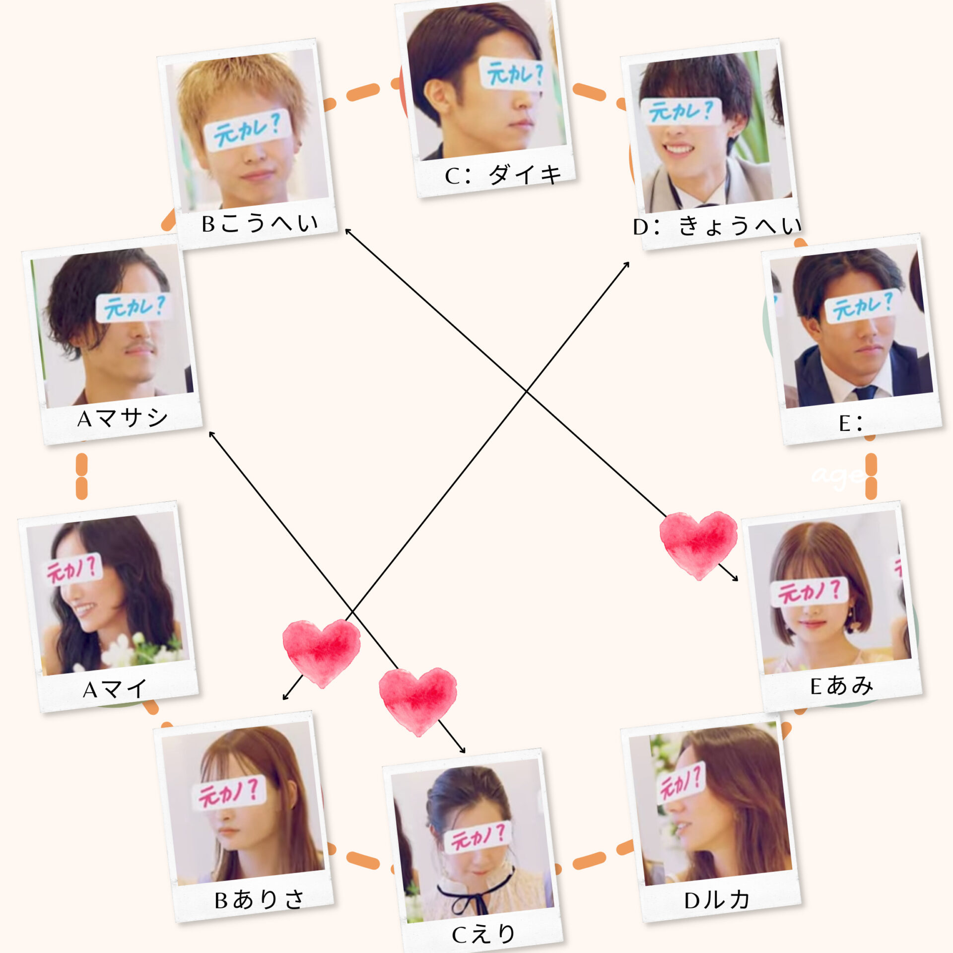 また、あみちゃんとマサシはかなりいい感じのようにも見えますが おそらく 最終的にはここの2人は付き合うことや 交際すること 成功することはないと予想します なぜかというと 第5話の中でなぜかえりちゃんの前で 絶対に歌うべきではない 楽曲を歌っており 優しさにかけていました あみちゃん からすると誰にでも等しく優しい人が好きだということを 前々からインタビューで答えているので 優しさがあった後はとても思いません あの瞬間から冷めて行っている可能性はかなり高いと考えられるのでそのことから考えてみても 最終的にこうへい君と復縁するという可能性は十分高いと予想します!