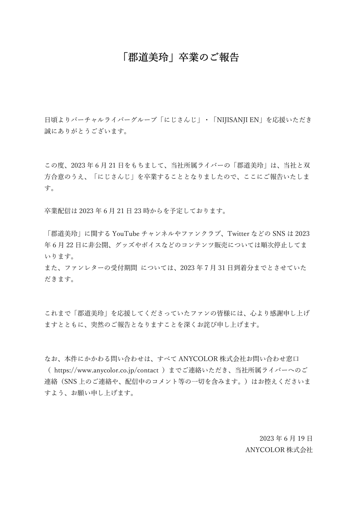 YouTubeやファンクラブ、SNSは6月22日に非公開、グッズ・ボイスなどのコンテンツ販売も順次停止。ファンレターは7月31日到着分まで受付。#郡道美玲 #にじさんじ
