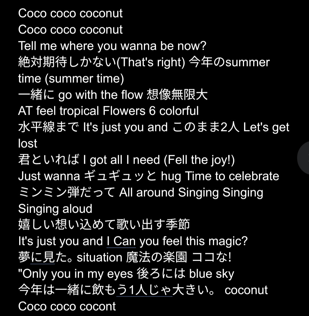 NiziUの新曲「COCONUT」の歌詞は、タイトルやMVからも感じられますが「夏を楽しむ」というメッセージが込められていると思われます。