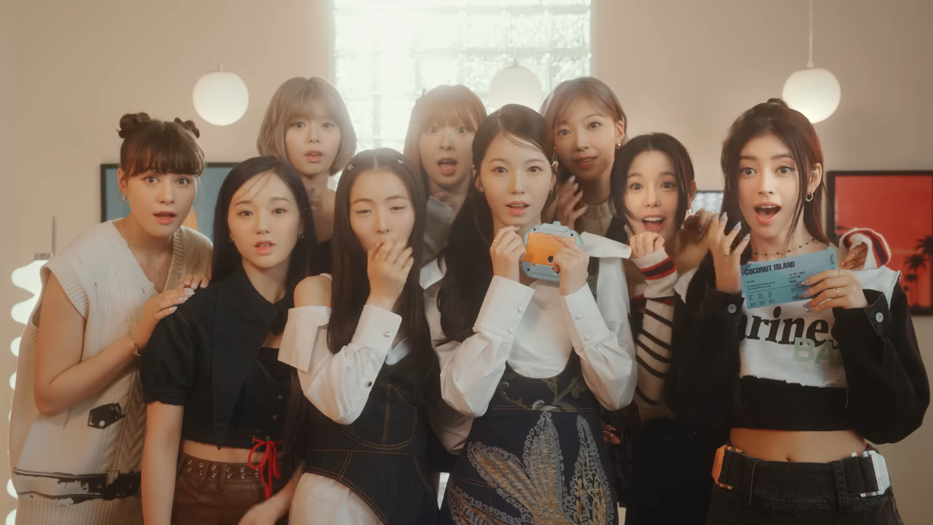 MVでは、NiziUのメンバーがビーチやプールで仲良く遊んだり、ヤシの実を食べたりしています。