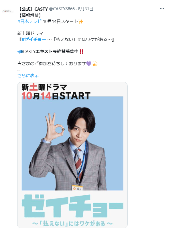 2023年8月31日以降、株式会社CASTYでは「ゼイチョー ~「払えない」にはワケがある~」のエキストラ募集を行っています。
