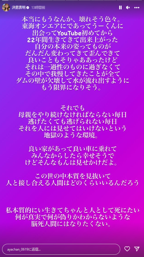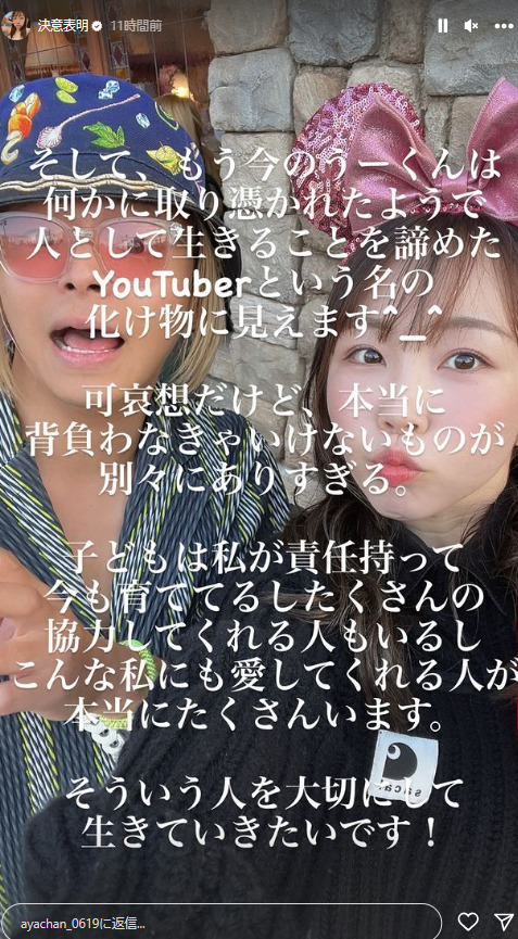 2023年10月17日、あやなんさんはX(旧Twitter)に「私は愛する夫と離婚をし新しい人生を自分らしく歩みます。」というメッセージを投稿しました。