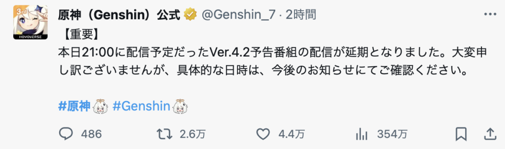 Ver.4.2「罪人の円舞曲」予告番組延期。理由は明かされておらず、具体的な日時も今後のお知らせで発表へ。#原神 #生放送延期 pic.twitter.com/XmYAR9oqaV