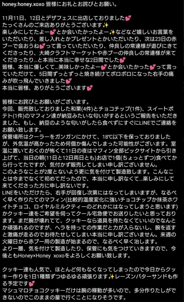食中毒を起こす人が出てきて、販売店のオーナーがインスタで謝罪とお願いを発表。