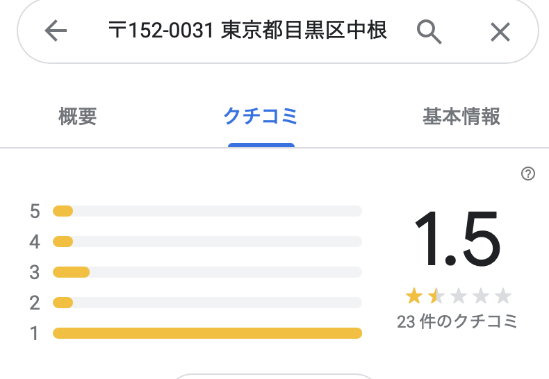 そんな中、星が1.5と言う事は 少し改善するポイントがあるようなお店が多くなっています。それでは実際のGoogleの口コミを見ていきましょう。