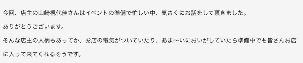 店主さんの接客や性格についてですが、Googleの口コミやその他今回のお店について話している個人のブログなどを見てみてもわかりますが、批判的なコメント等はほとんどありません。