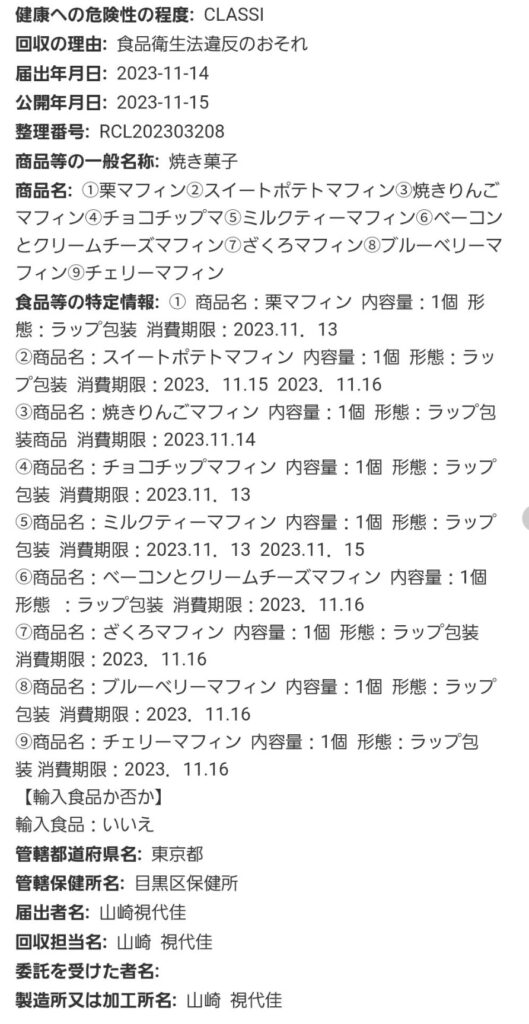 2023年11月16日厚生労働省がクラスIのリコール対象と認定