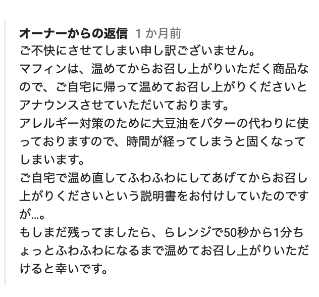 しかし、可能性としてはかなり高い確率で、このマフィンが今回話題になっているマフィンだと考えられまして、実際にこのコメントに対して、オーナーからも、以下のようなコメントがあります。