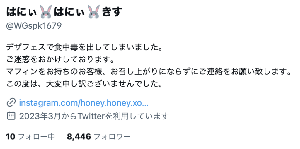 本当に申し訳ございませんでした。— はにぃ🐰はにぃ🐰きす@デザフェス11月11日、12日 赤ブー11月23日 (@WGspk1679) November 13, 2023