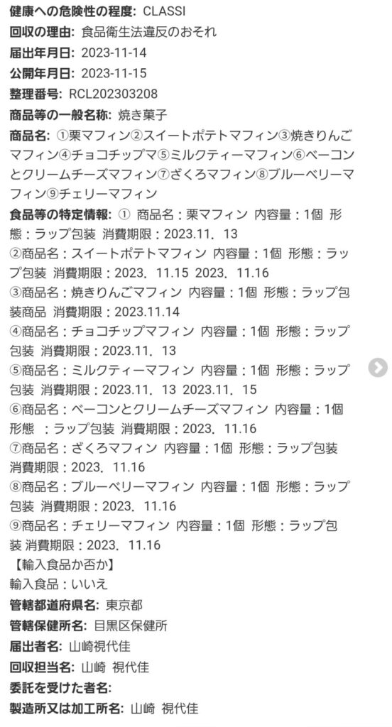 今回オーナーさんが事態が話題になった翌日 11月14日に保健所に指示を仰ぎに行きました。その結果、11月15日に 厚生労働省がリコール対象とし、全国に呼びかけをしました。リコール対象になったのは今回販売した商品全てとなっており、驚きなのが健康への危険性の程度については最大となる「CLASS Ⅰ」(クラス1)のリコール対象としています。
