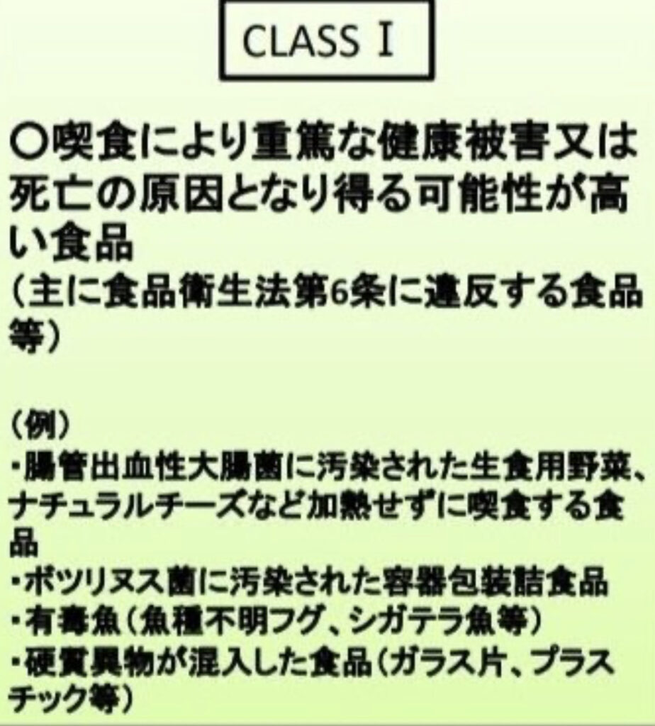 実際にどのくらいやばいのかと言うと、厚生労働省の国が食品にガラスの破片やプラスチックが混ざっていたり、有毒生の魚のふぐなどの猛毒の食品などに適用される最大クラスに危険だと示したリコールとなっています。