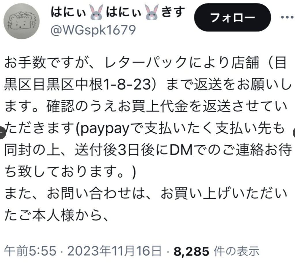 申し訳ございません。お名前、お電話番号は不要— はにぃ🐰はにぃ🐰きす (@WGspk1679) November 14, 2023