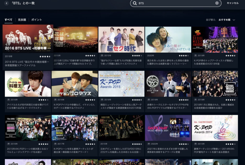 現在期間限定ではありますが、実際に複数と言うのはどういうものが見れるのかと言うと、以下のような形ですBTSで7人で活動していた時のライブが今なら無料で見放題となっています。
