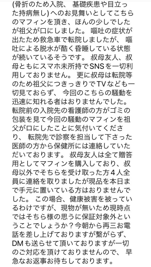 店主は、約3000個のマフィンを自主回収すると発表しましたが、その方法はレターパックやゆうパックなどの不適切なもので、購入者や被害者からの不信感や不満を招きました。