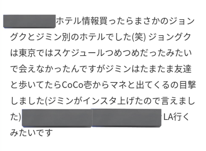 そしてジョングクとジミンちゃん、それぞれ一緒のホテルに泊まっていると言うわけではなく、別々のホテルに泊まっているようですね。実際に2人が止まってしまうと情報が割れてしまったときに、また大変になってしまうので、場所についても分けているのではないかと考えられます。