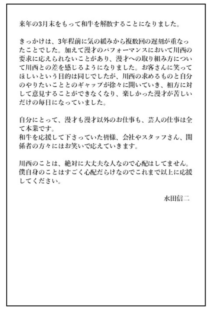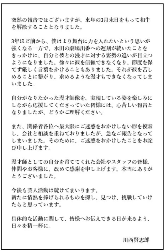 和牛解散、川西さんは我々への謝罪やスタッフやお客様に対しての感謝を書いてるのに対して水田さんが一切そういうのを書いてないとこや「心配なんで応援してください」で終えてる所で人間性の差を感じたし、今後どっちを応援したいかは明白だよね。 pic.twitter.com/0SyoQCmvvk