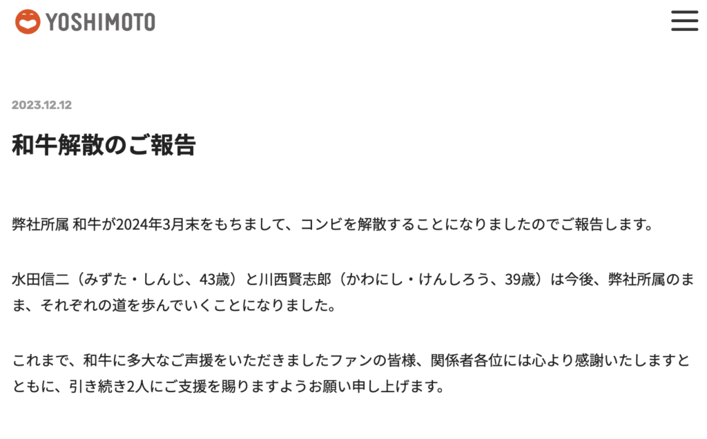 和牛解散理由⑨ お互いにやりたいことをやるため