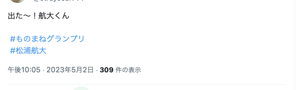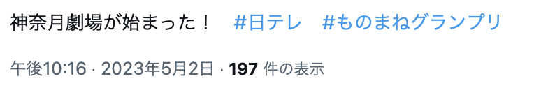 また 神無月さんなど優勝候補の他の人物についても、今まで番組の後半に出てくることが多くなっていません。実際に今回の番組のメインとなる部分なので、早めに放送してしまうと視聴率が下がってしまいます。神無月さんや松浦さん、青木さんなどを目当てに来ている人も多いので、そういったメインの人たちを後半に持ってきて 番組を盛り上げていくのではないかと考えられます。実際に神無月さんが2023年5月2日にものまねグランプリ出演した際も22時16分に出演しているので、本当に後半の部分に出演することが多いことがわかります。実際の出演時間がわかるTwitterのコメントがこちらです。
