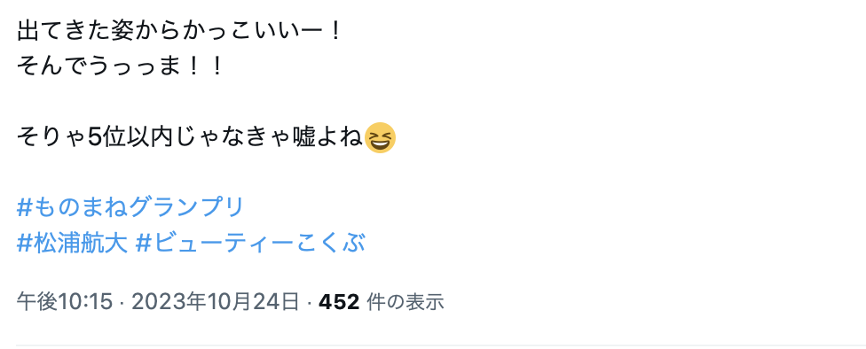 Mr.シャチホコの吉村くんのまねも楽しみ🤭#ものまね#ものまねグランプリ#よよよちゃん#Mrシャチホコ— ショウ (@sho_m_ohs) December 12, 2023