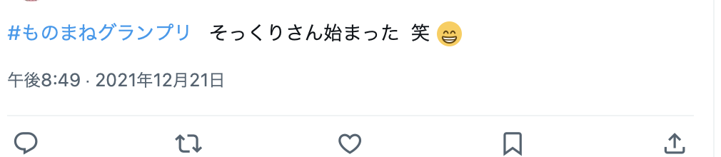 というのも、過去の2020一年や2019年の放送のものまねグランプリの内容について、本日はかなり序盤にそっくりさんが放送されています。実際の2021年12月21日に放送されたものまねグランプリの 放送時間については20時49分となっています。