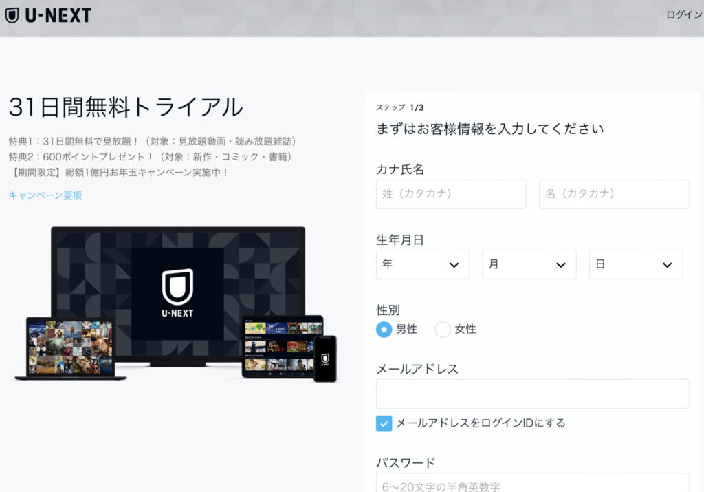 まず無料で見る視聴方法の手順についてですが、U-NEXTの無料キャンペーンから登録をします。