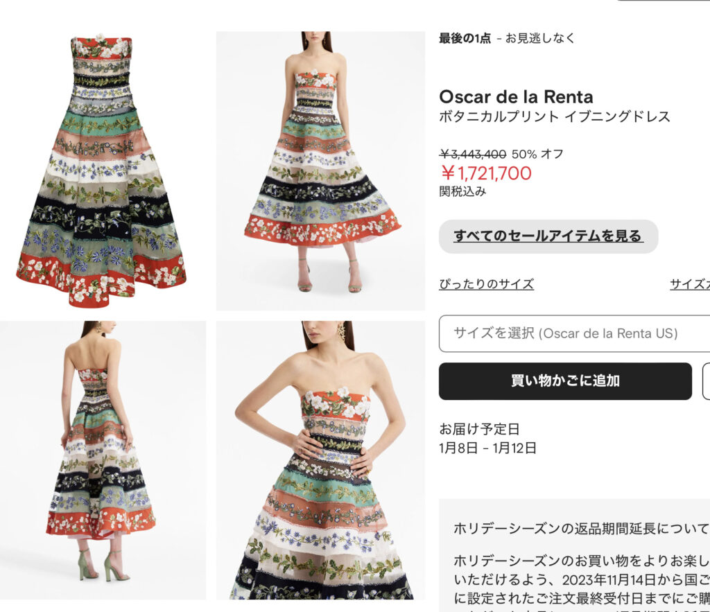 1枚目のドレスについては、 超高額なドレスとなっています。というのも、定価価格が3,443,400円のドレスとなっています。現在セール中と言うことで50%引きと言うことからも172万1700円になっているようですが、それでも一般人にはなかなか買えないドレスですね。