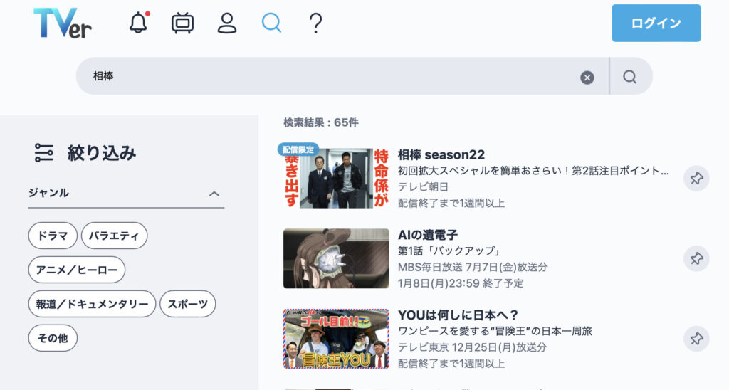実はTVerで相棒と検索しても、以下のようにすぐ出てきてくれないことがわかっています。