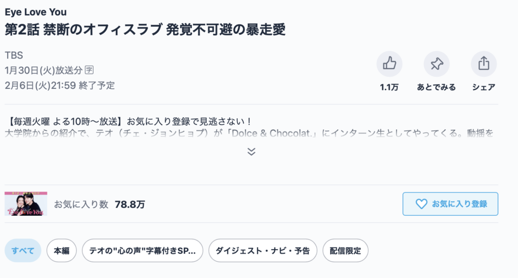 【テオの”心の声”字幕付きSPバージョン】第1話 僕の事は好きですか?私の心に舞い込んだ年下の純情韓国人#TVer #eyeloveyou @eyeloveyou_tbshttps://t.co/jLjRlOTsG6— TVer【公式】 (@TVer_info) January 23, 2024