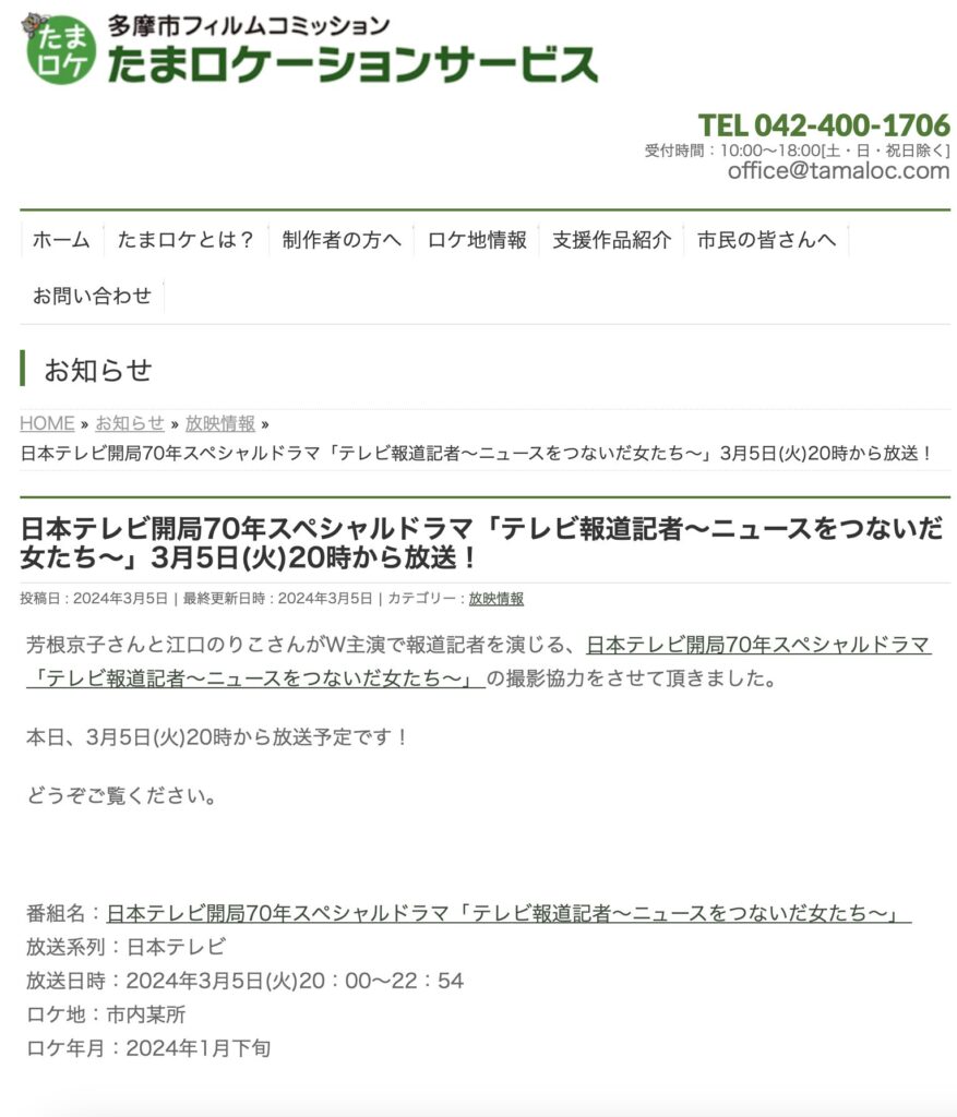 芳根京子さんと江口のりこさんがW主演で報道記者を演じる、日本テレビ開局70年スペシャルドラマ「#テレビ報道記者 〜ニュースをつないだ女たち〜」の撮影協力をさせて頂きました。本日、3月5日(火)20時から放送予定です!#多摩市 #ロケ地 https://t.co/8OBWJvHgcZ