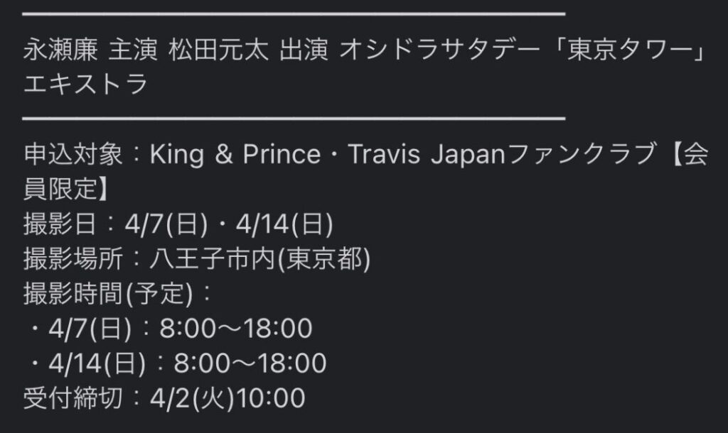 東京タワーのエキストラ2日間申し込んだけど、こうゆう系って倍率どんくらいなんだろ #永瀬廉 #東京タワー pic.twitter.com/g9QC1nyxxB