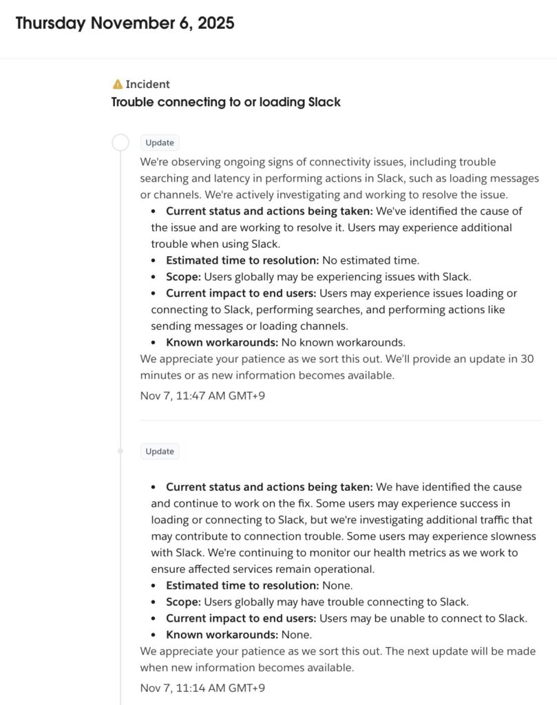2025年11月7日(金)早朝、ビジネスチャットツールSlack(スラック)で全国的な接続障害が発生しました。